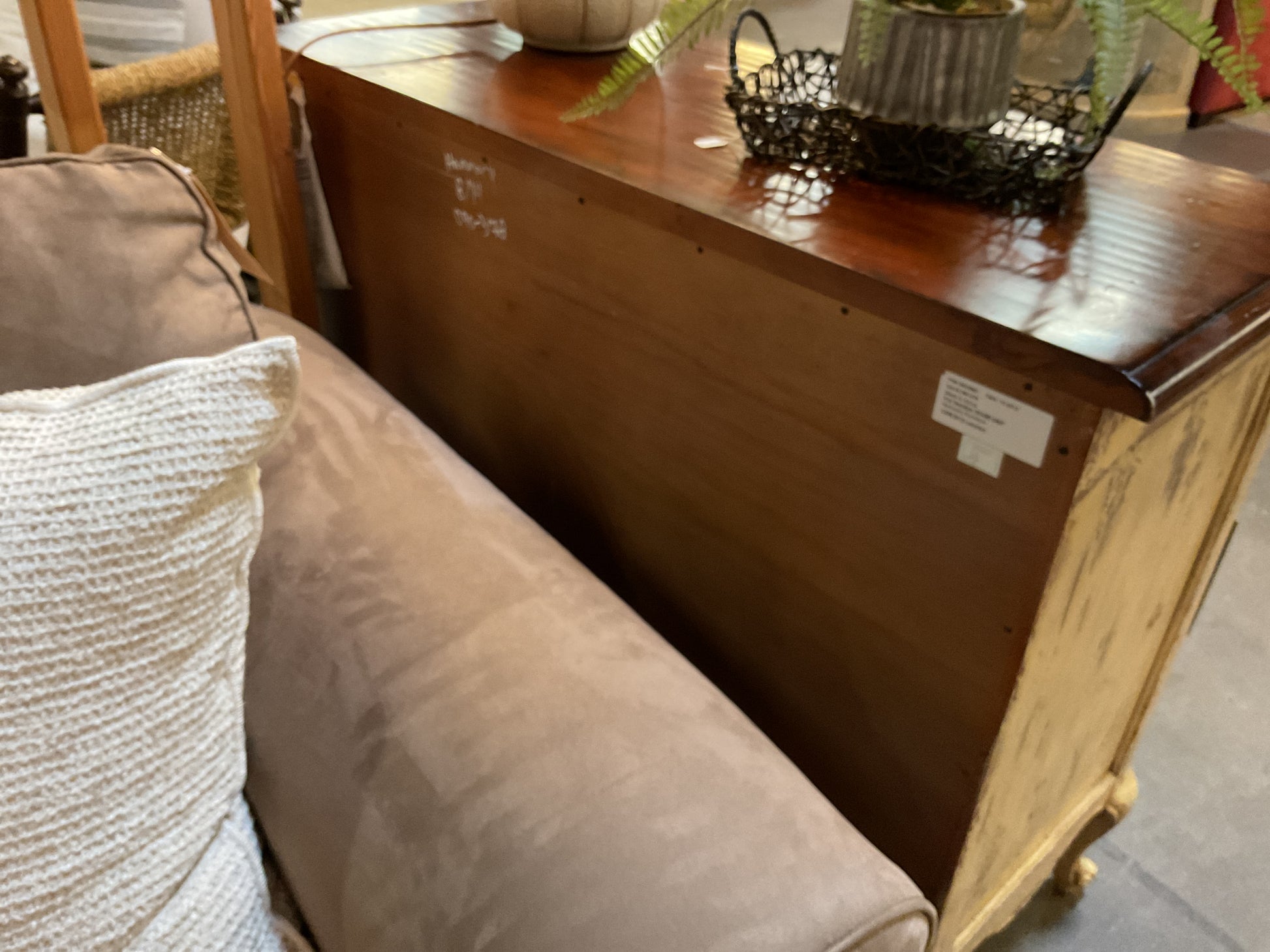 Expertly crafted by Hammary, the 3 Drawer Arabesque Chest exudes a timeless charm with its distressed finish. The elegant cabriole legs and symmetrical arabesque motifs add a touch of sophistication. A must-have for those seeking a classic yet unique addition to their home decor. Used - Good Condition (missing some handle hardware)