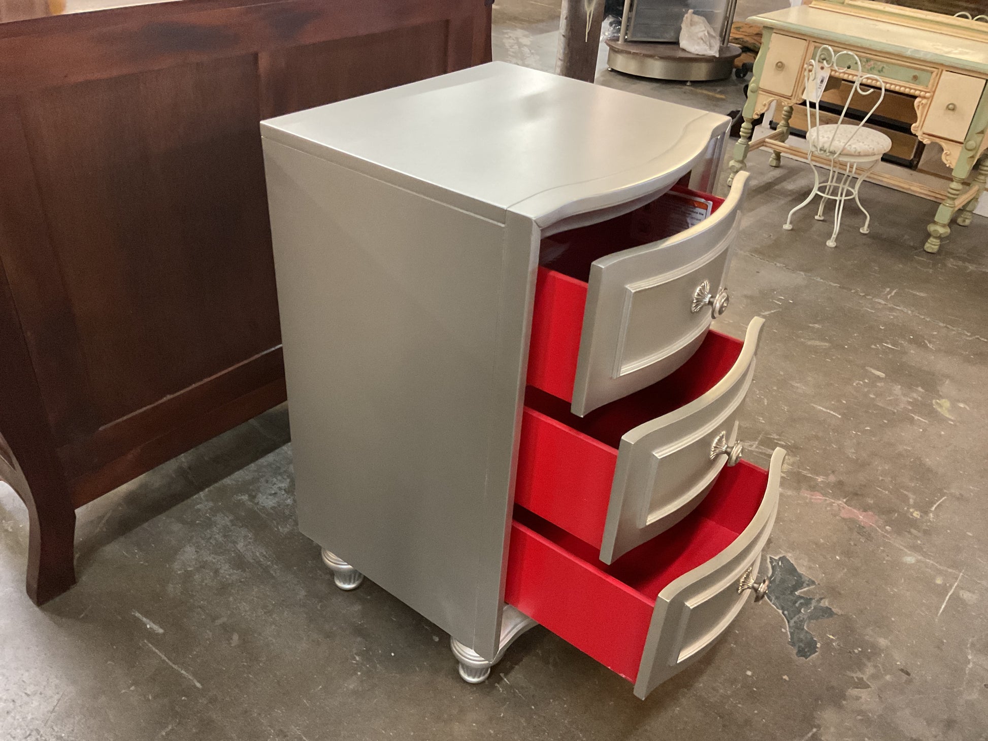 Crafted from solid wood, this 3 drawer chest boasts a modern metallic matte finish. With ample storage space, it's perfect for keeping your belongings organized while adding a touch of sophistication to your home decor. Expertly designed for durability and style, this chest is a must-have for any room. New condition
