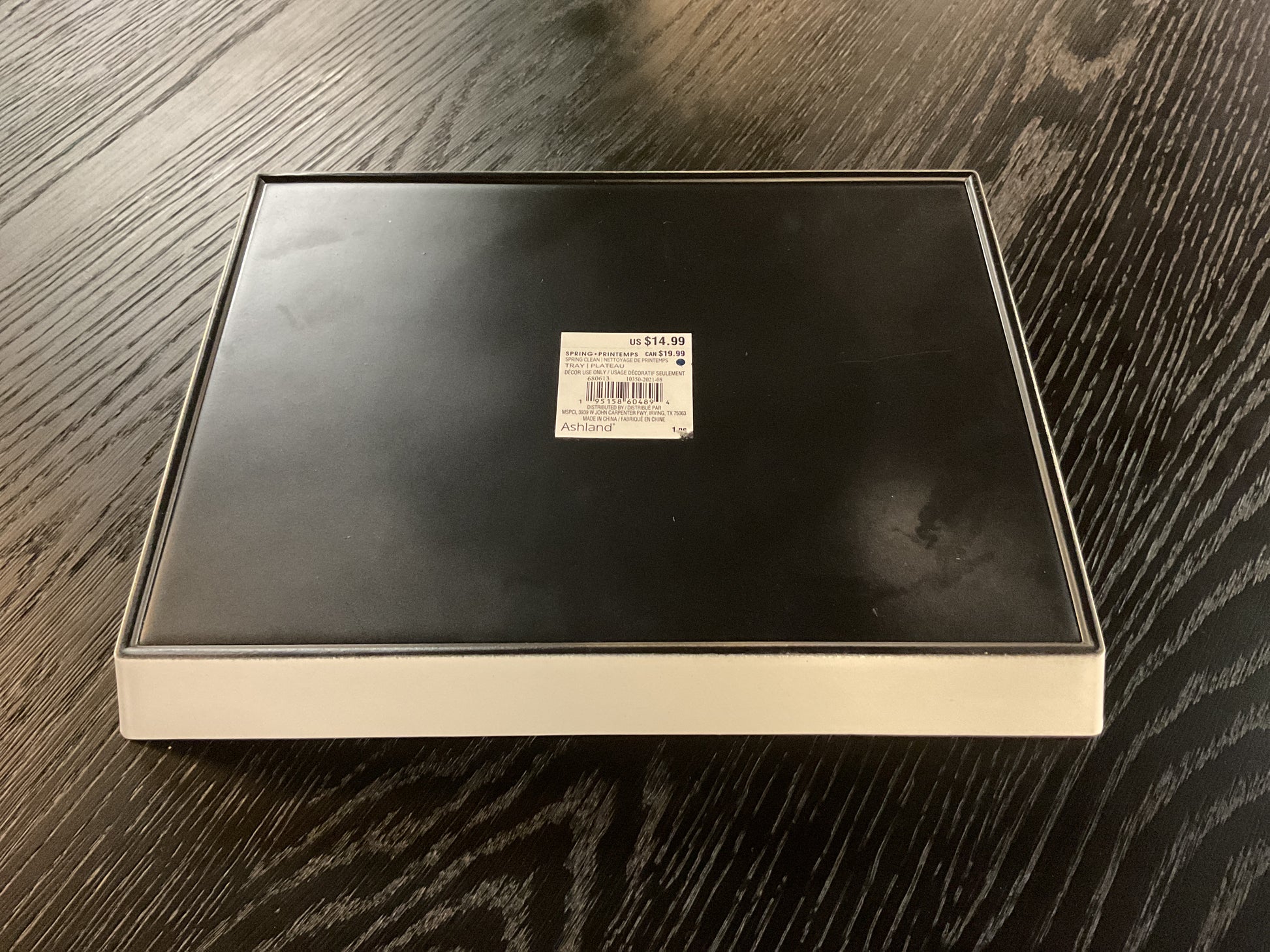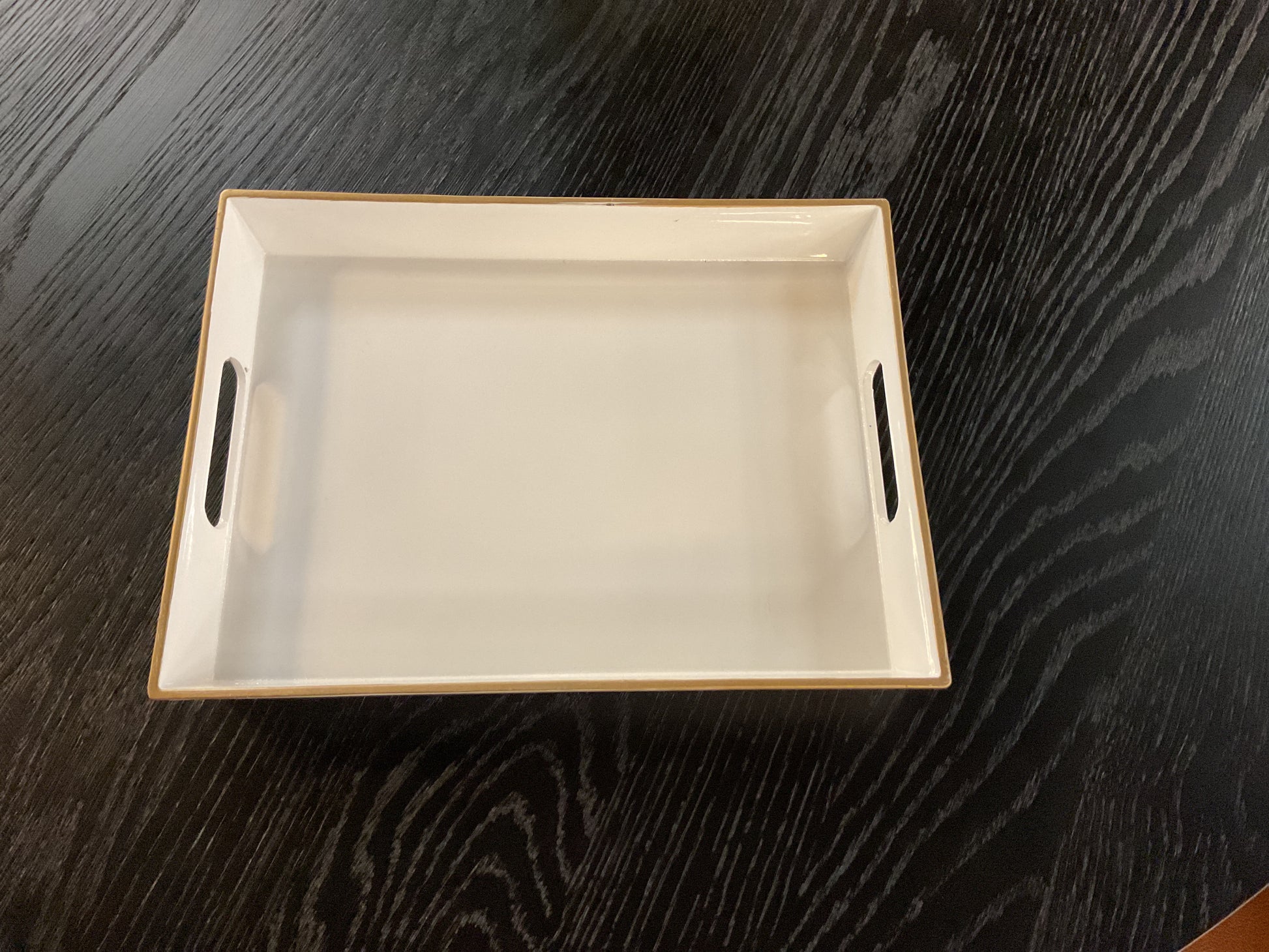 Elevate your home decor with our elegant Accent Tray. This white tray with a matte gold trim adds a touch of sophistication to any room. In good used condition, it's perfect for displaying your favorite items or serving drinks to guests. Welcome style and functionality into your space with our Accent Tray.