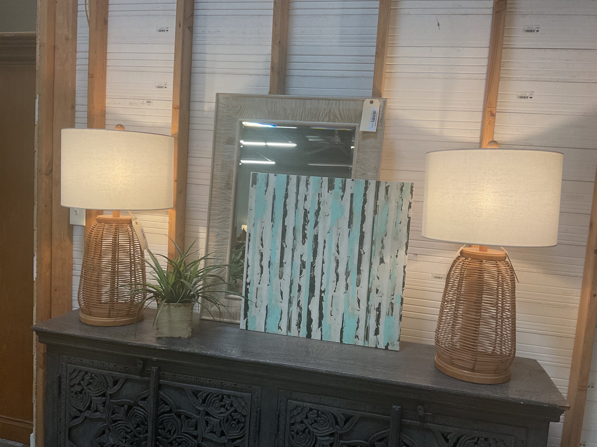 This Aspen Tree Canvas features a unique, textured design in sea foam green, black, and white. Expertly stretched on quality canvas, this piece adds a touch of nature and sophistication to any room. 24”W x 24”H