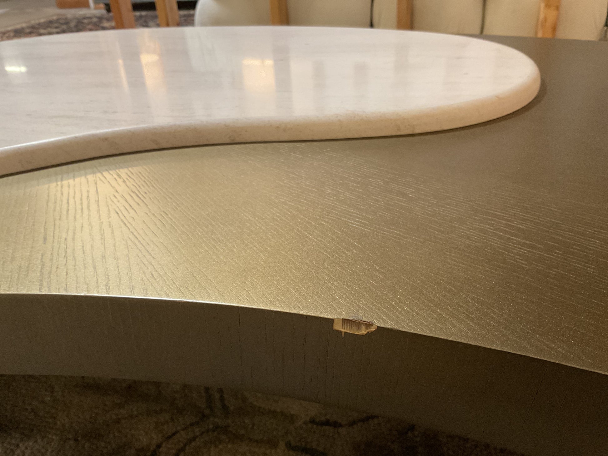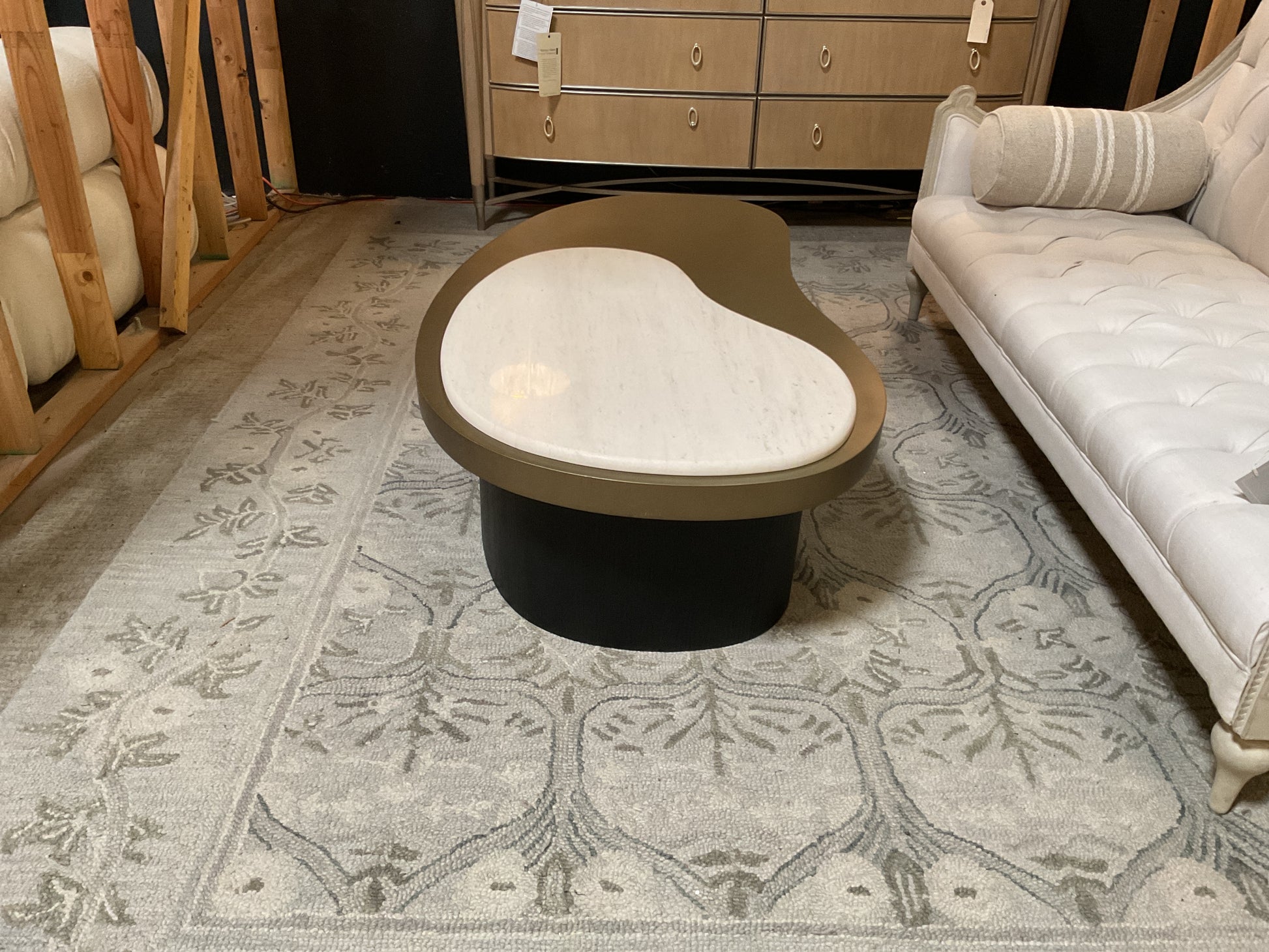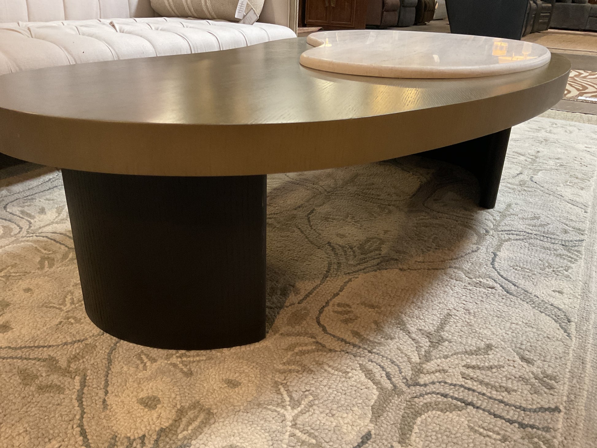 This Caracole Contrast Cocktail Table boasts a sleek design with a unique asymmetrical top. The top features quarter-sawn oak in a bronze finish, adding a touch of elegance. A kidney-shaped stone section adds visual interest, while the curved pedestal base provides stability and style. Perfect for a modern living space.