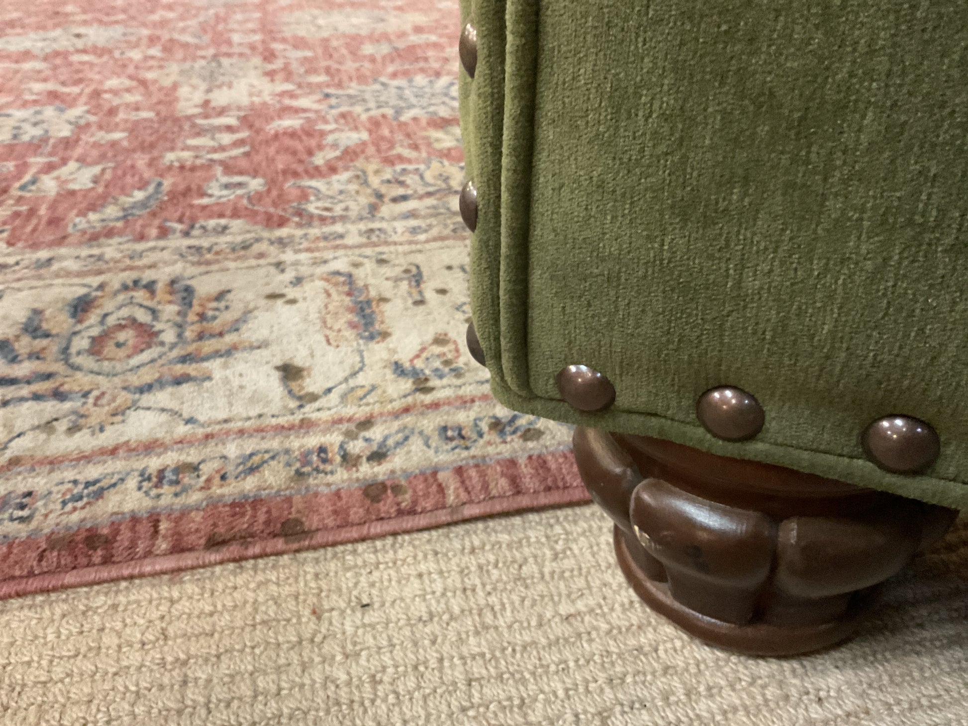 Enhance any living space with our Custom Upholstered Velvet Club Chair. Crafted with a solid wood frame and adorned with large brass nailheads, this chair exudes luxury. The rich green velvet upholstery and contrasting plaid cushion add a touch of sophistication and comfort. Elevate your decor with this elegant and timeless piece. Used - excellent condition