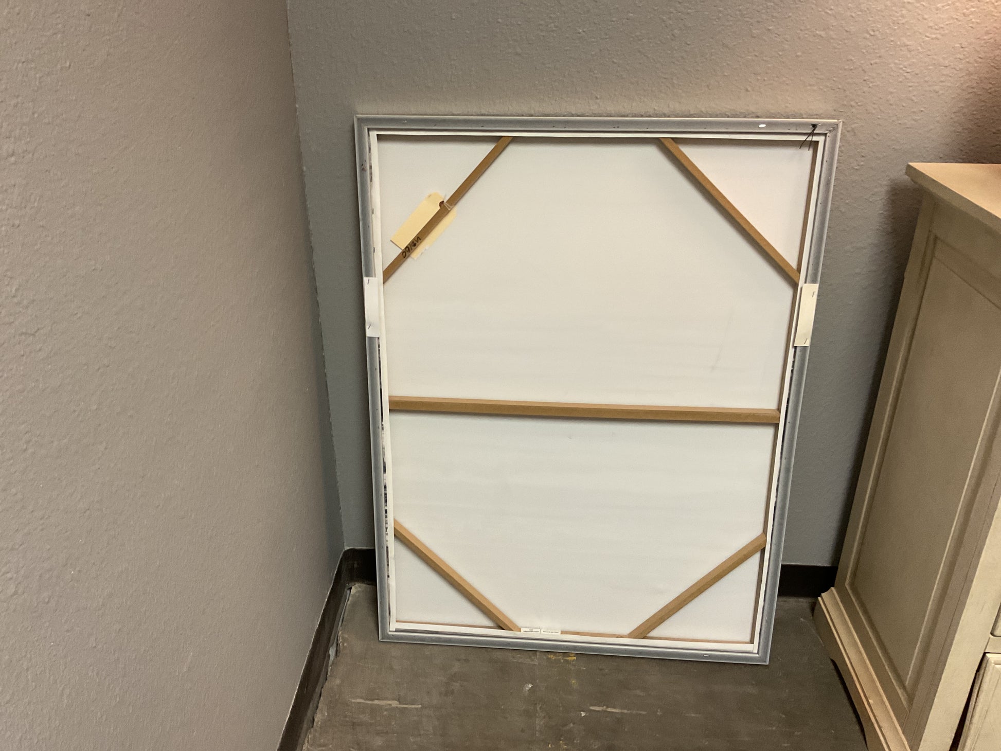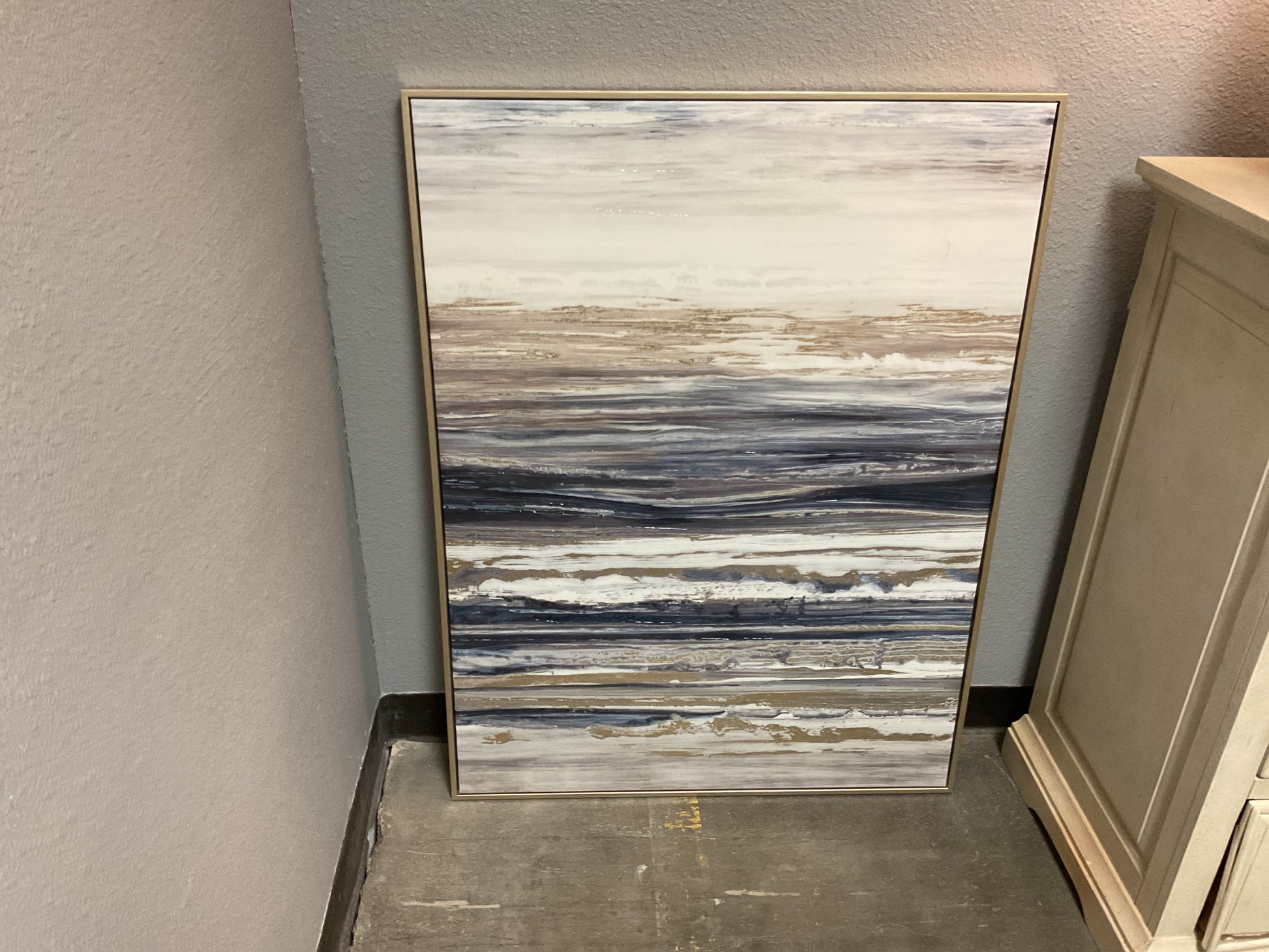 Experience the beauty of the ocean with our Framed Canvas Seascape Print. This stunning abstract art piece features subtle metallic accents that add a touch of elegance to any room. Encased in a thin gold brushed metal frame, this print exudes a sense of sophistication and style. Bring the calming energy of the sea into your home today. 41”H x31”W Used - Good Condition