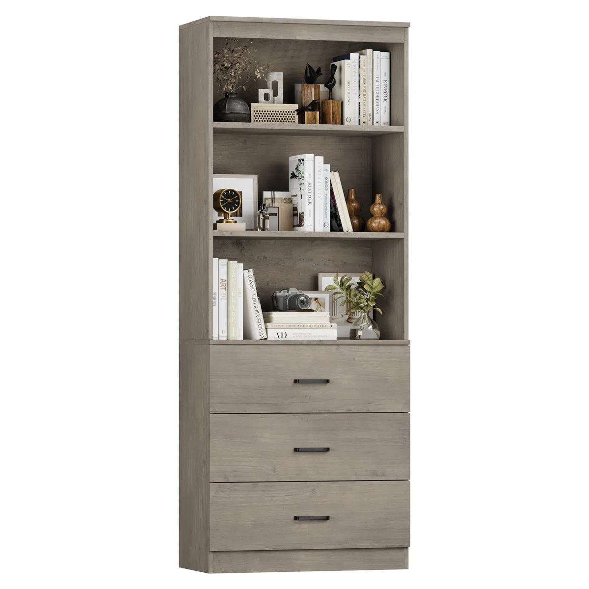Maximize the storage in your home office or living room with this sleek and functional bookcase. It comes with three open shelves - just right for displaying your favorite book collection or a fresh succulent (or two) - and three spacious drawers for everything from media items to important files. This 70.9" tall bookcase is made from engineered wood with a neutral finish, so it's sure to complement a variety of color palettes in your modern space. We also love how the chrome-finished handles and simple crown molding round out this piece. Plus, it comes with a restraint device for added safety. New condition 70.9”H x 23.8”W