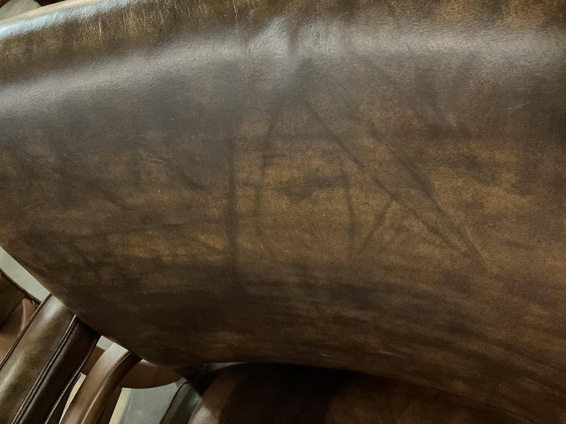 Expertly crafted with a high back for optimal support, this leather armchair exudes elegance with nailheads lining its sides. It brings a touch of luxury to any space. Enjoy the perfect blend of style and comfort with this armchair. Used-Good Condition