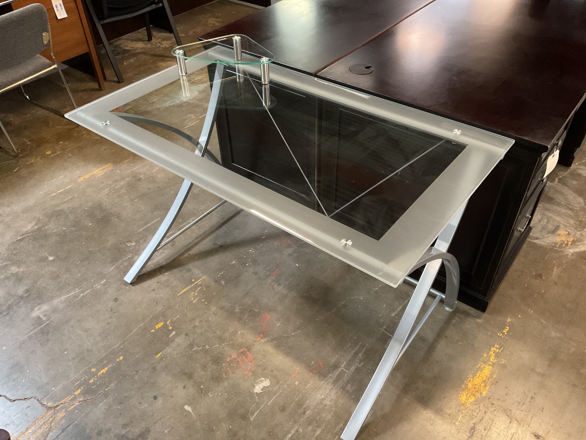 Introducing the Main 48" Glass Writing Desk, the perfect addition to any modern workspace. Crafted with tempered glass and a frosted border, this sleek desk offers durability and style. The sturdy metal frame provides stability, making it a reliable choice for all your writing needs. Upgrade your office with this expertly designed desk. Used-Good Condition