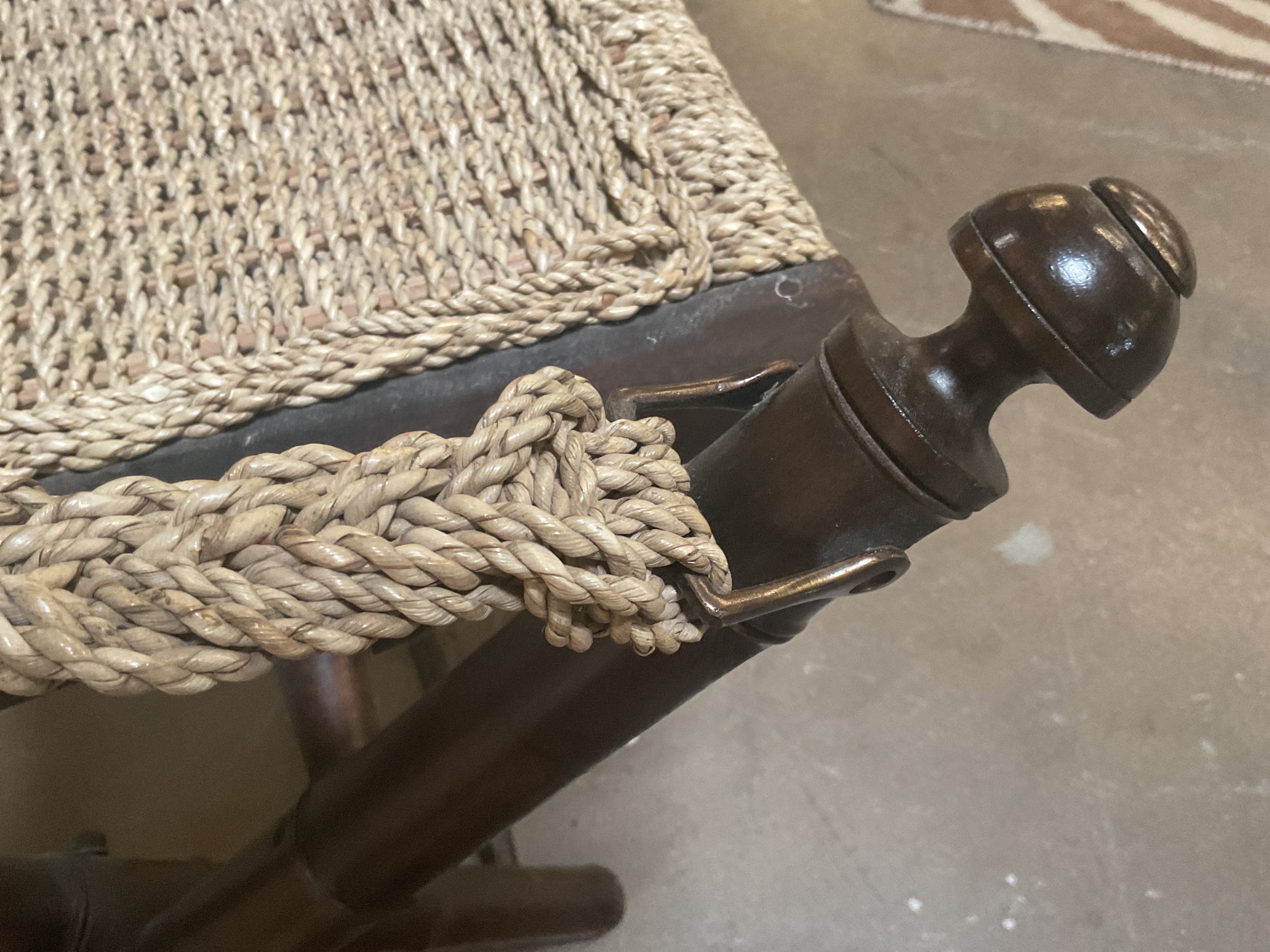 Discover the rare and elegant Maison Jansen Style Campaign Chair, crafted from faux bamboo and rope and accented with brass hardware. This stunning piece is a true statement of sophistication, inspired by the renowned Parisian interior designer Maison Jansen. Elevate your space with this exquisite and unique chair. Used -Good condition