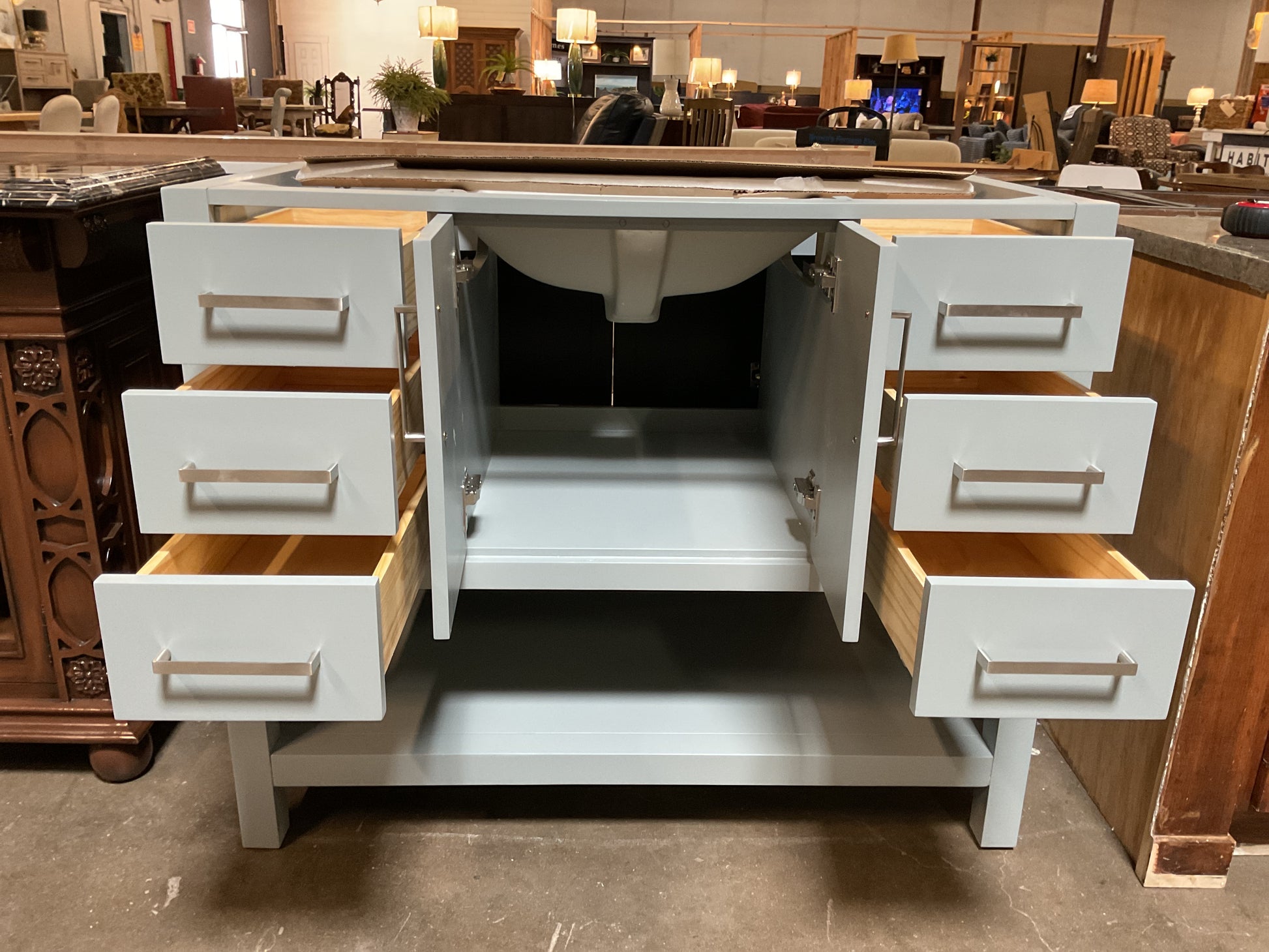 Upgrade your bathroom with the Moille 42" Single Bathroom Vanity. The soft close doors and drawers provide convenience and functionality while the solid wood construction ensures durability. The vanity also comes with a sink and backsplash for a complete and stylish look. New-Scratch & Dent