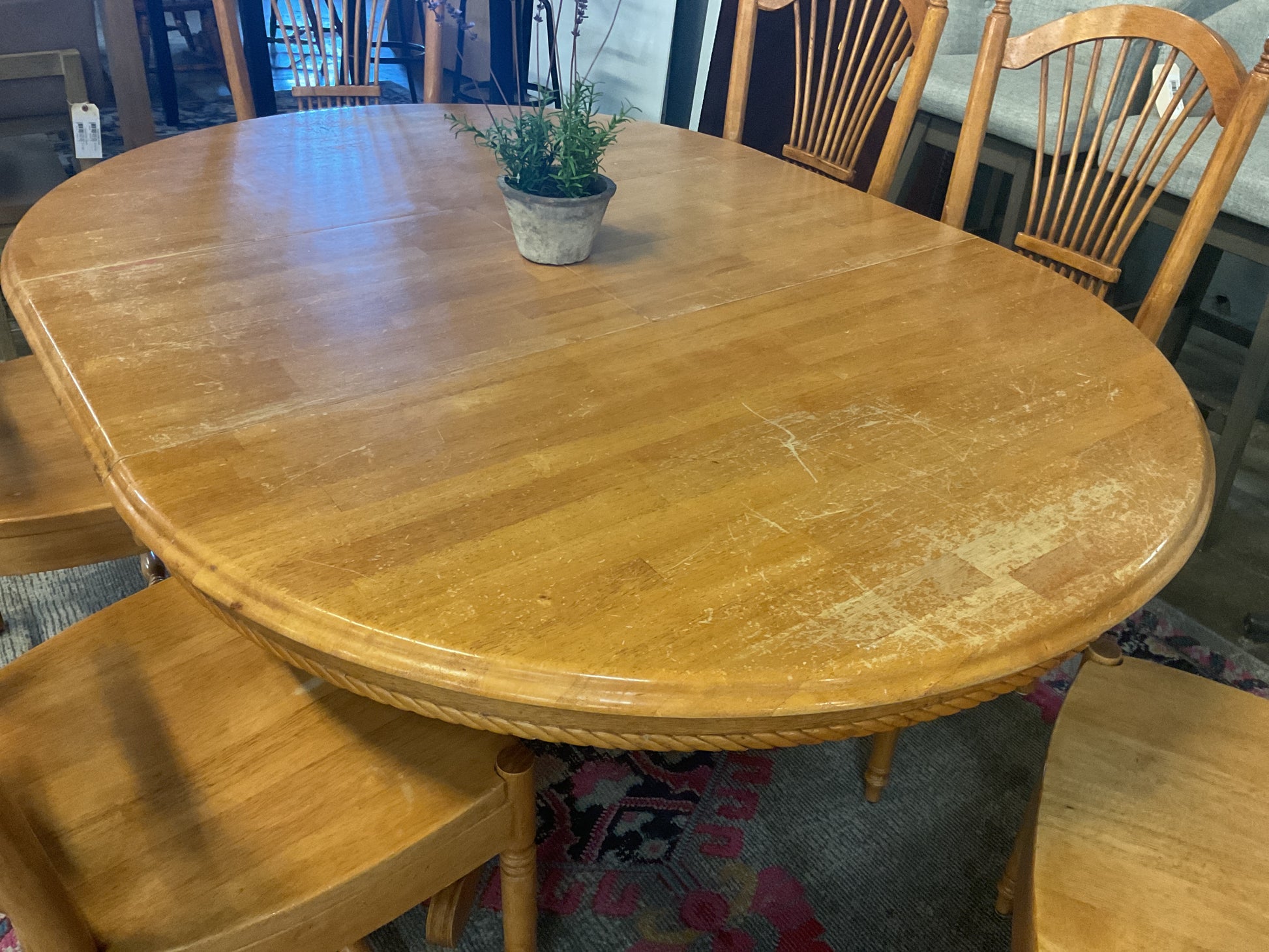 The round table features a convenient leaf for easy expansion, while the 6 included wood chairs provide comfortable seating. Elevate your meals and gatherings with this stylish and functional set. Used- Fair condition