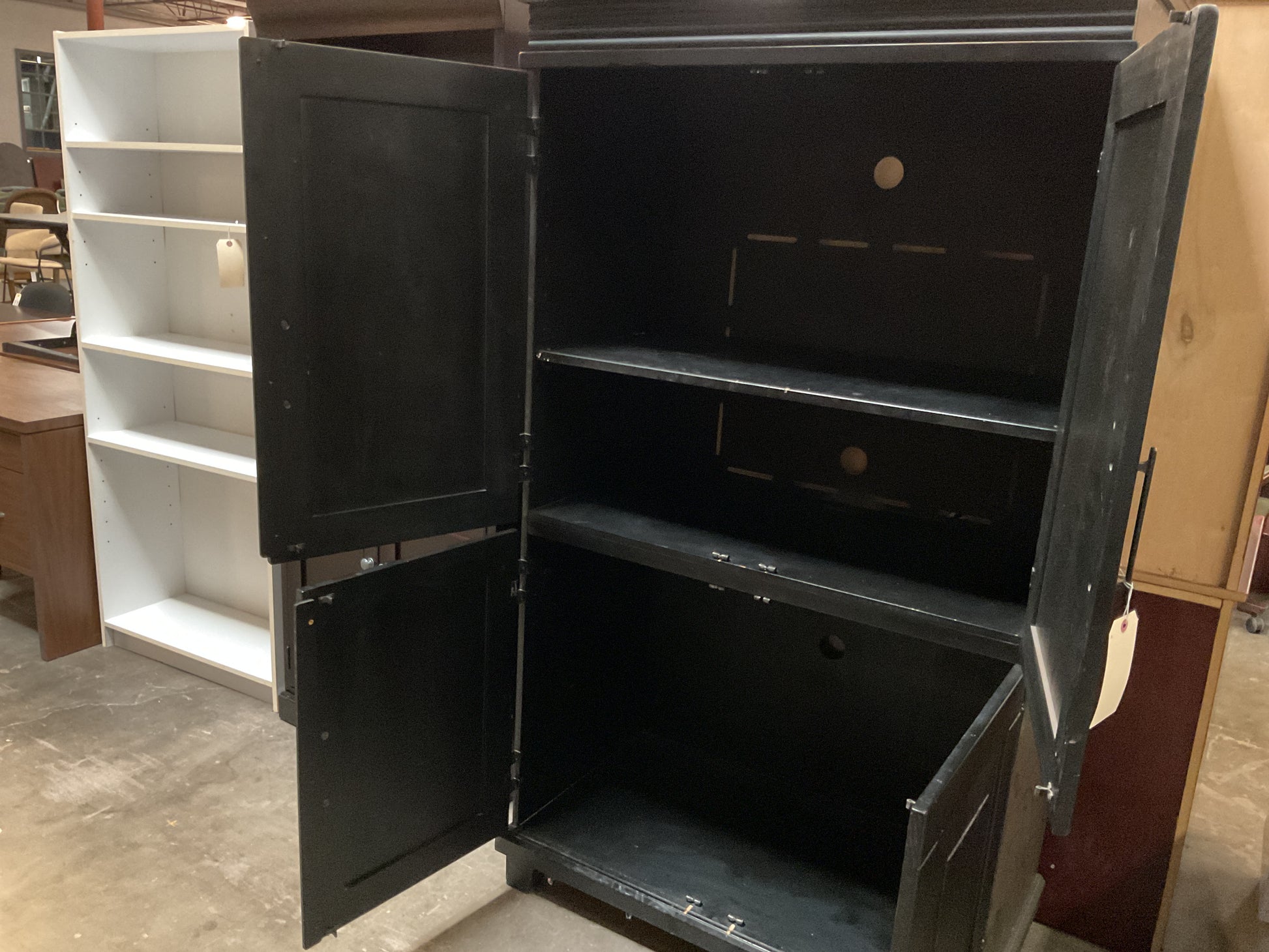 This Pier 1 Black Distressed Wood Armoire & TV Cabinet is in great condition and offers versatility with its adjustable shelf. The 4-door design provides ample storage for various items. A perfect blend of style and functionality. Used - Good condition