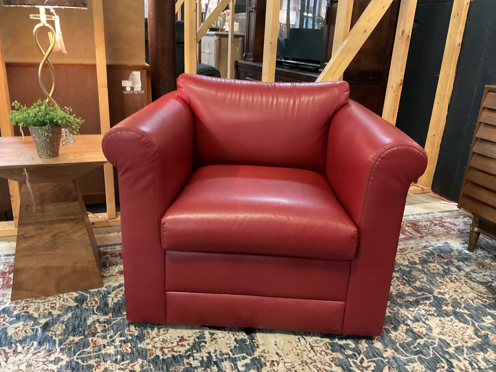 Looking for a statement piece? This bold red vinyl club chair is the perfect pop of color to liven up any room. And with its excellent used condition, you can add style and durability to your space. Don't miss out on this unique and eye-catching addition to your home! 34”W x 31”H x 33”D