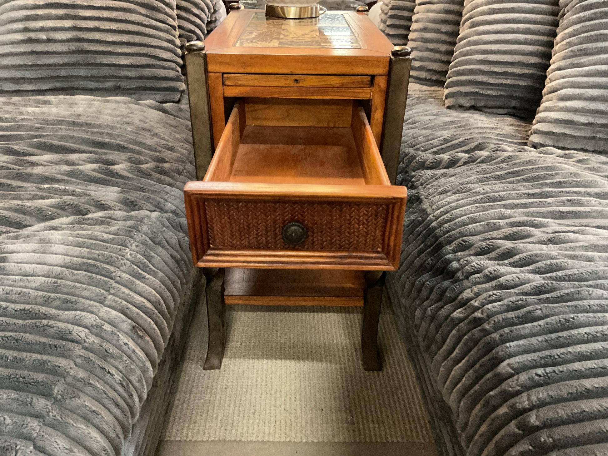Introducing the Riverside Chairside Table, featuring a stunning marble marquetry top, uniquely twisted and hammered metal legs, and a convenient pullout drawer. Elevate your living space with this exquisite blend of elegance and functionality. Experience the luxury of marble while enjoying the durability of wood and metal. Used-Good Condition