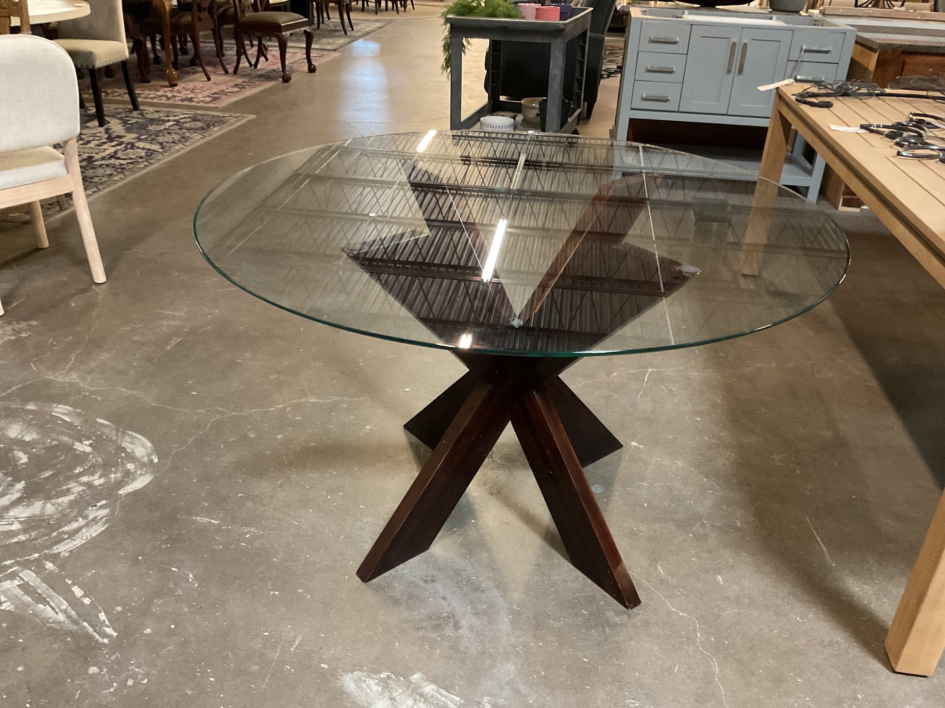 This modern, round glass top table is supported by a sturdy wood base. The glass top adds a touch of elegance while the wood base provides stability. Perfect for any modern or contemporary space. Used- Good Condition 48” Rd