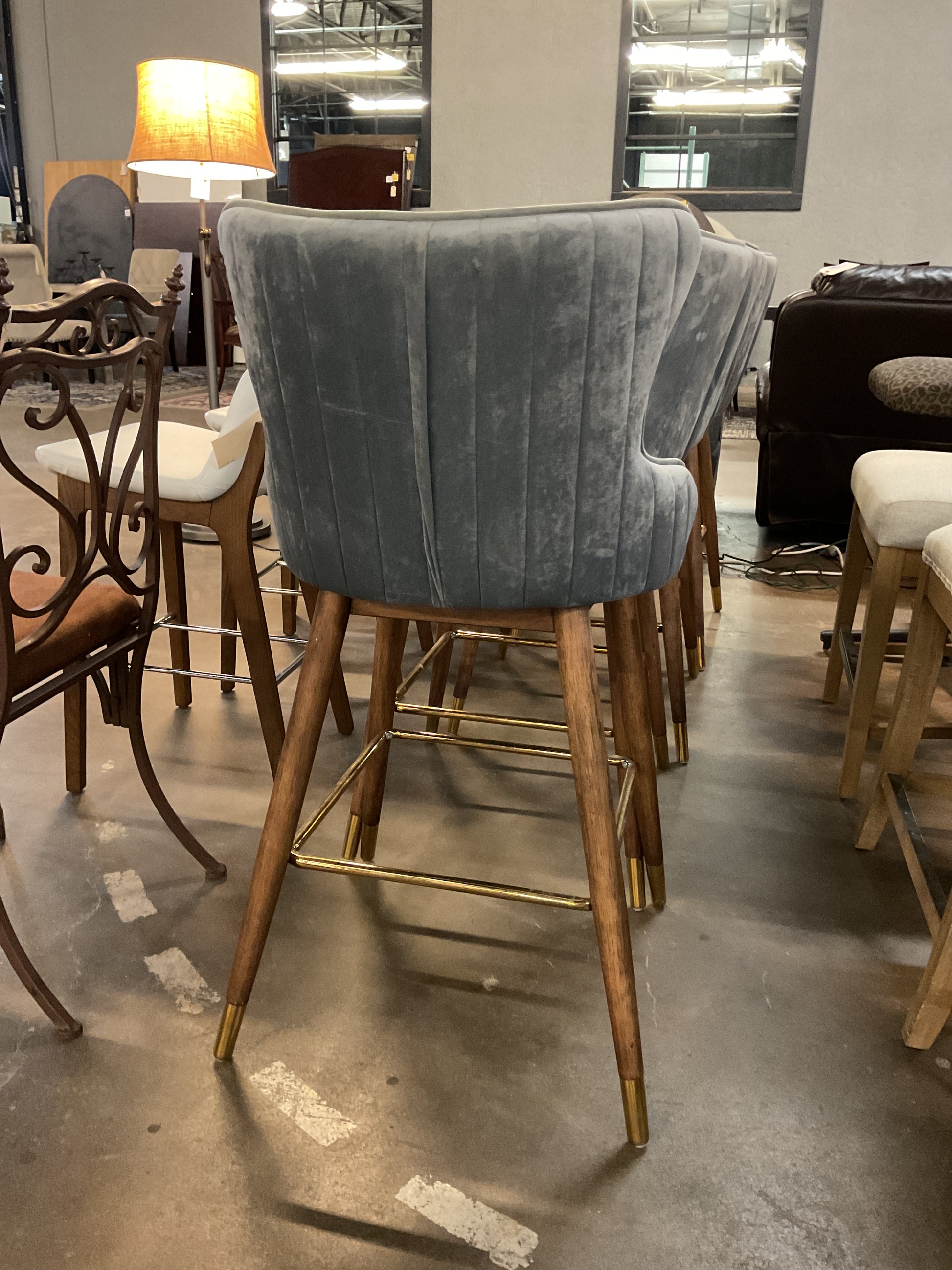 Experience sophistication and comfort with RoundHill's Wingback Counter Height Stools. Featuring luxurious upholstered Leland fabric and a sturdy wood base, these stools add a touch of elegance to any space. The gold tone metal accents provide durability and style, creating the perfect blend of form and function. Used-Good Condition