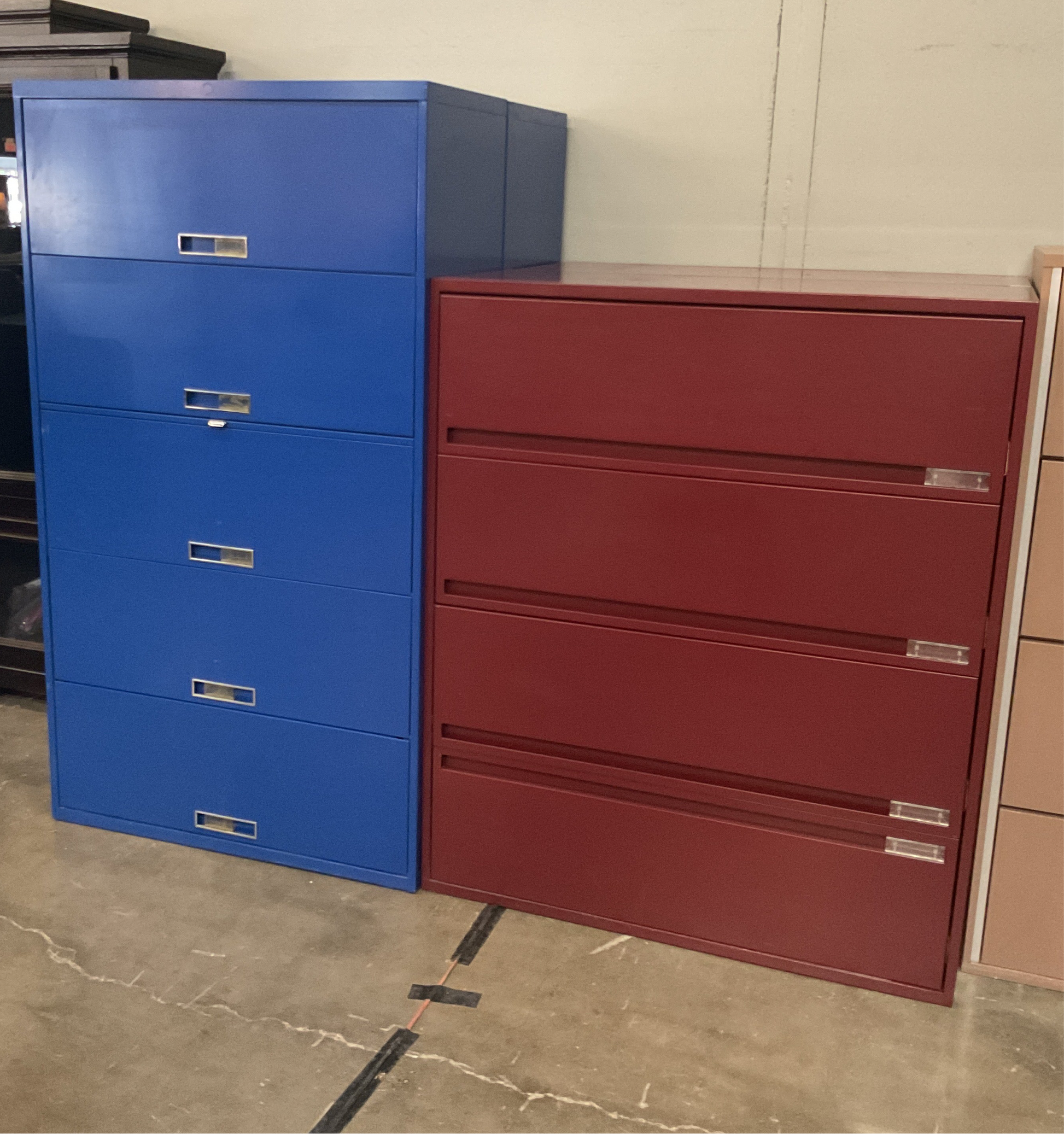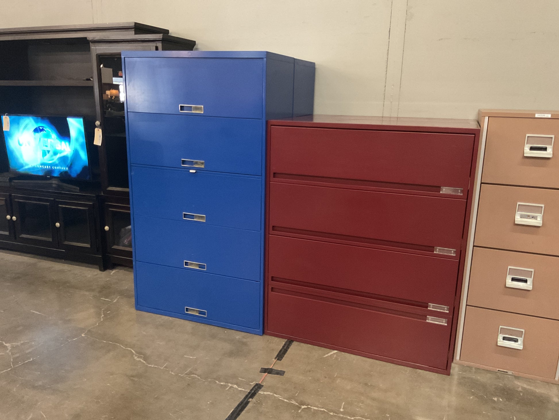 This Sandusky Lee 600 Series lateral file cabinet is made of steel and has four full suspension file drawers for storing and accessing letter-size or legal-size hanging files. The drawers have recessed handle pulls and extend fully on ball-bearing slides to facilitate access to the contents. An interlocking drawer system helps ensure that only one drawer is open at a time to help avoid tipping. This cabinet has a center lock that secures all the drawers with one key and locks both sides of each drawer for security. Two keys are provided for the lock. This lateral file cabinet has leg levelers for use on uneven surfaces, and a powder coat finish to resist chipping and corrosion. It is commonly used for organizing and storing documents in professional, commercial, and industrial office environments. Used - Good condition