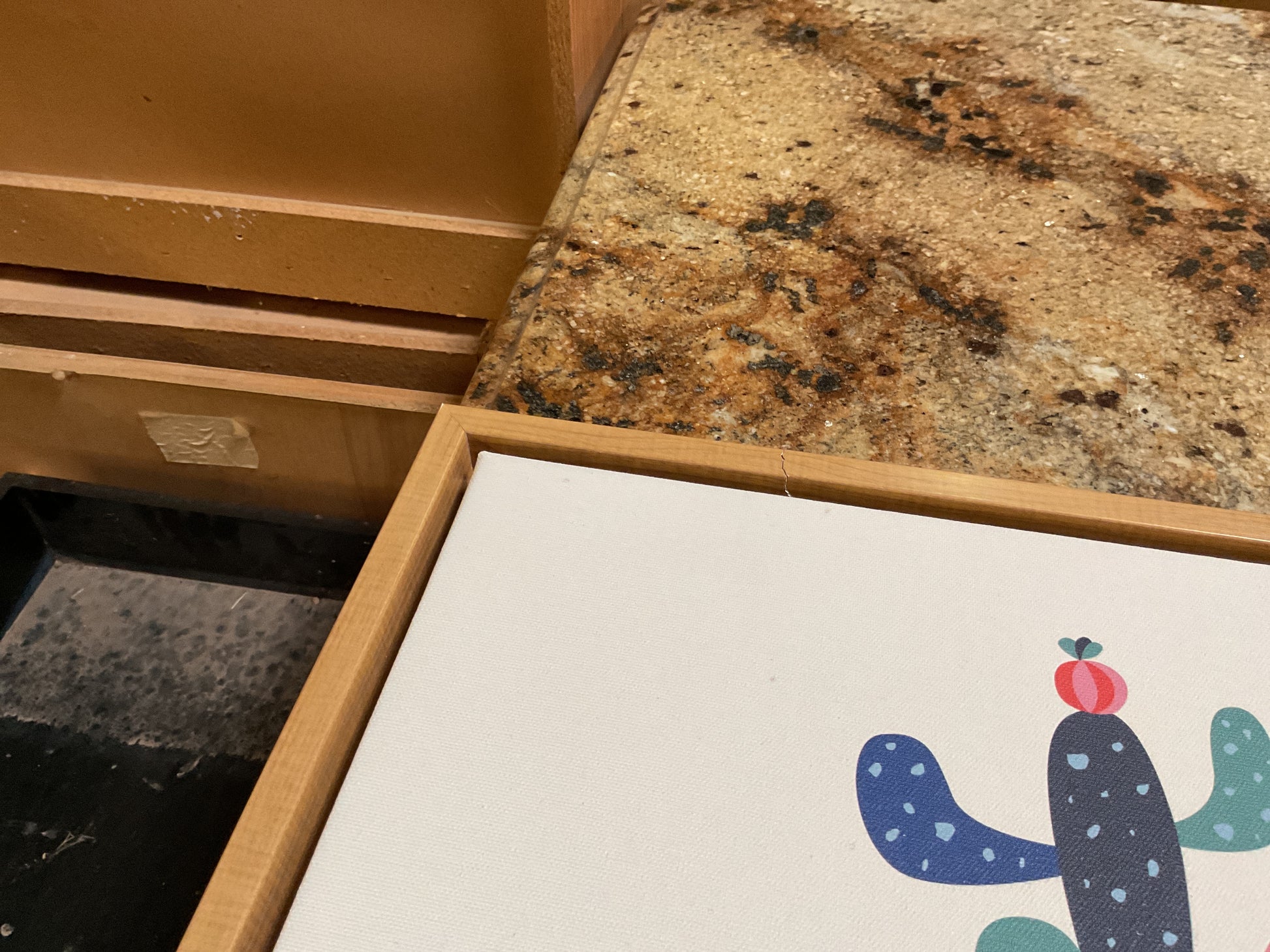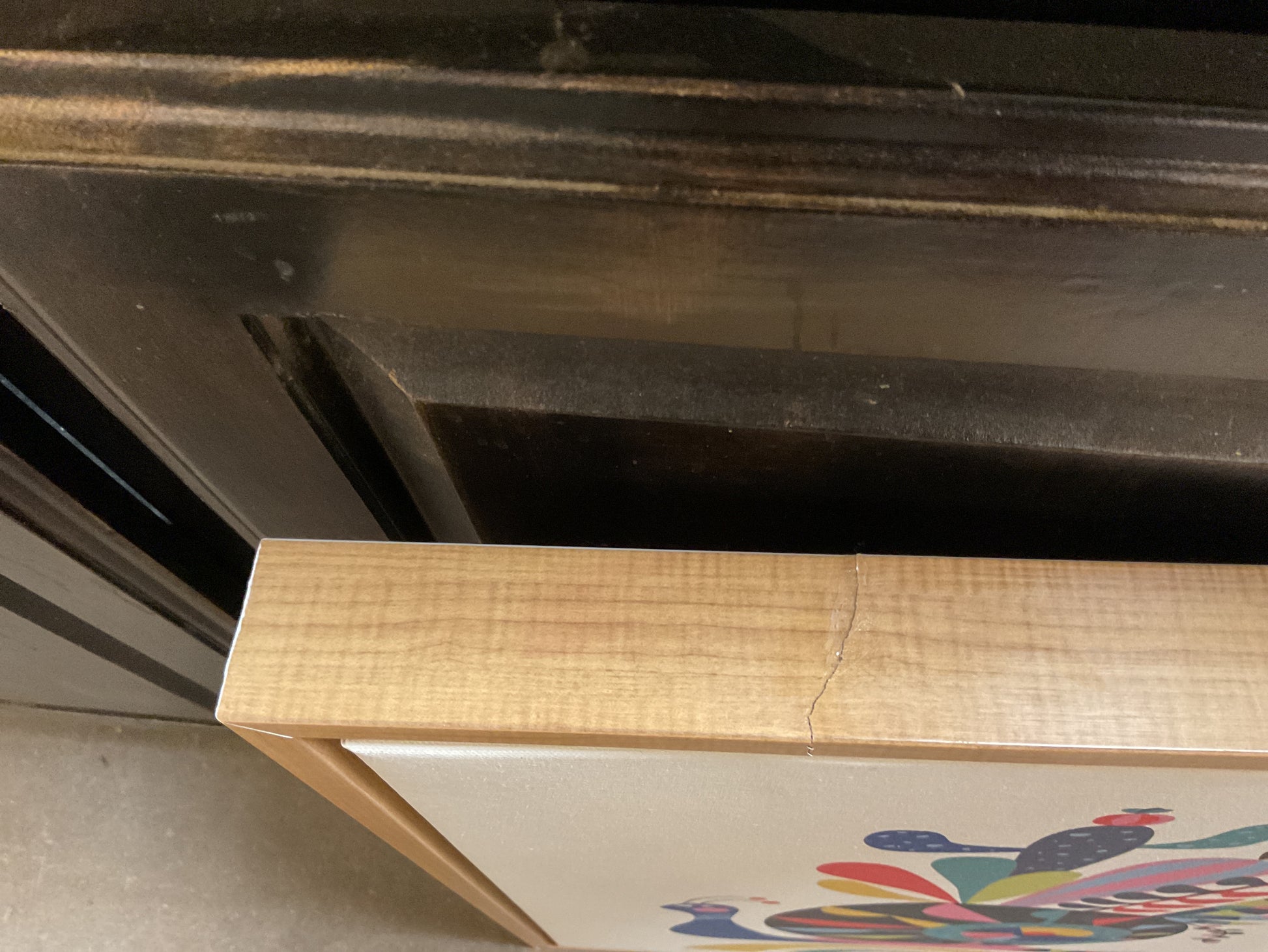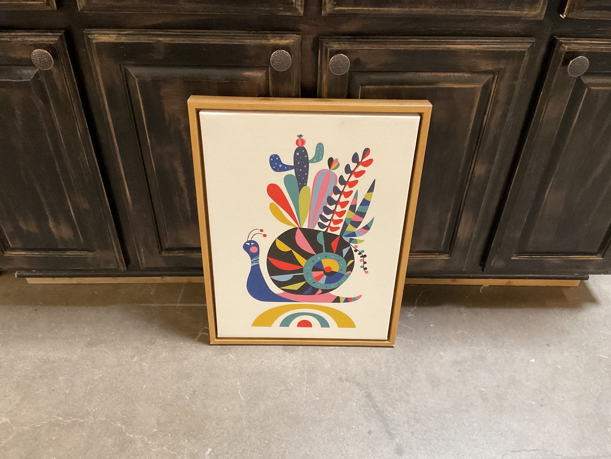 Add some whimsy and color to your walls with Sylvie Snail framed canvas art by Rachel Lee! This vibrant accent piece is sure to inspire a smile and add a touch of fun to any room. Its playful design and bold hues will make it a standout addition to your home decor. Used - Good condition ( crack on top has been glued -pict) 18.25”W x 24.25”H