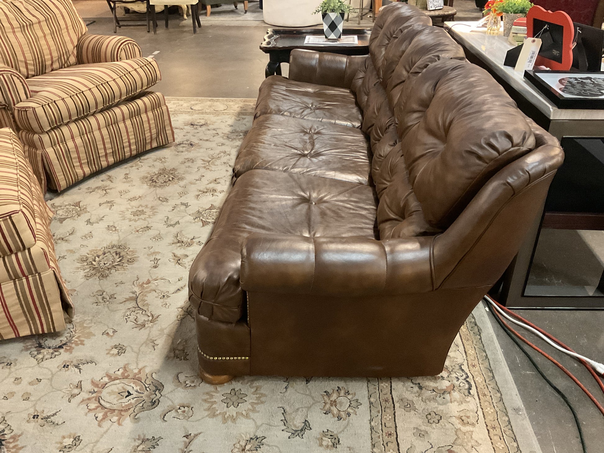 This Tufted Faux Leather Sofa is a 3 seater sofa featuring brass nailhead accents. Despite its used condition, it still offers ample use and adds character. Bring a touch of sophistication to your space with this stylish and durable piece. Flawed areas pict. Used - Good condition