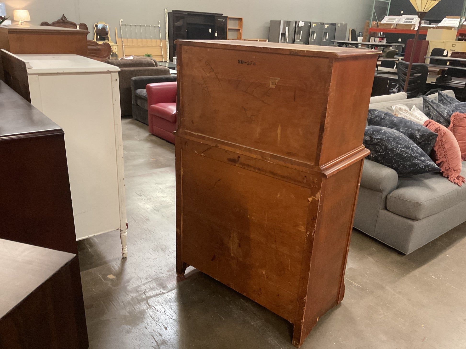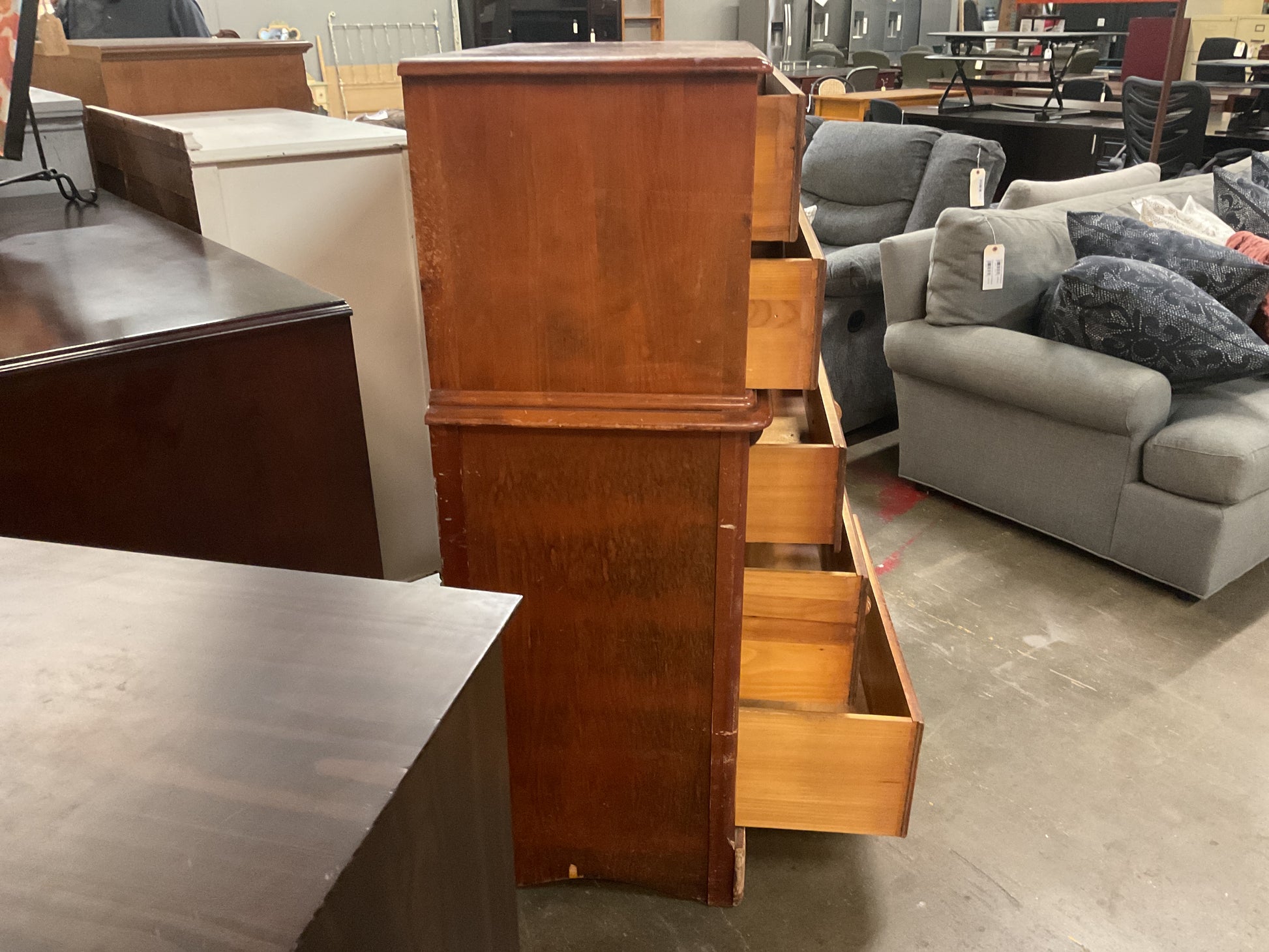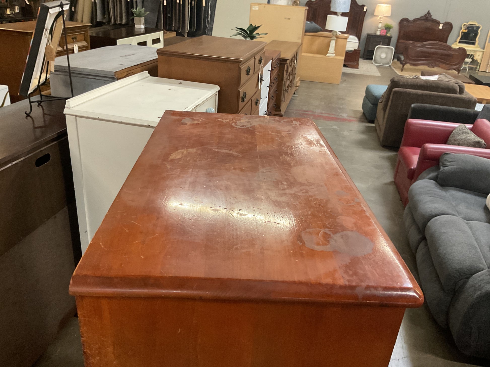 This vintage wood chest of drawers boasts solid wood construction in a stylish trunk design. Some sanding and repainting may be desired for full restoration, but this chest is in good condition and adds a touch of charm to any space. Upgrade your storage with this timeless piece. 33” W x 19” D x 53” H Used - Good condition